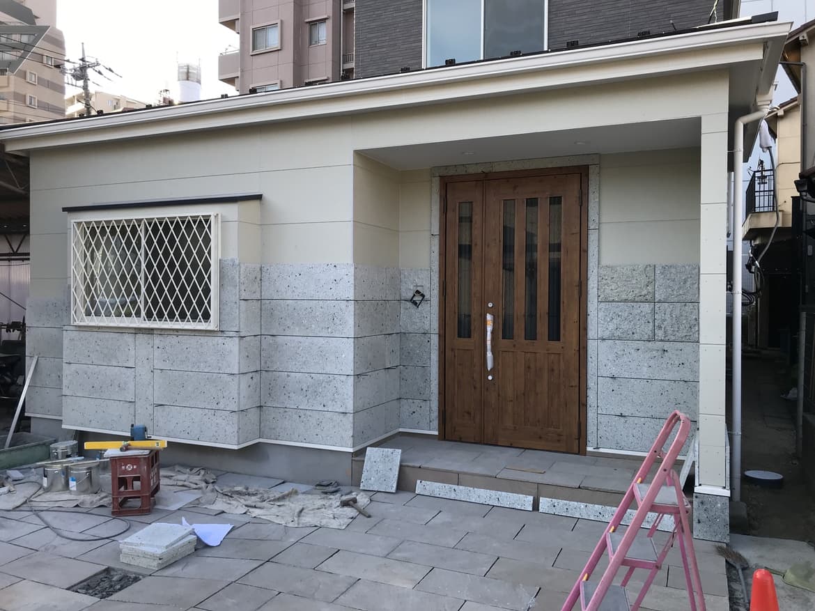 一般家屋の外壁に大谷石を貼っています。厚さ20mmの板石を外壁一面に貼っていきます。水を吸わないように保護材を塗布してあり劣化を防ぎます。御影石と違い光を反射せず落ち着いた雰囲気を醸し出します。